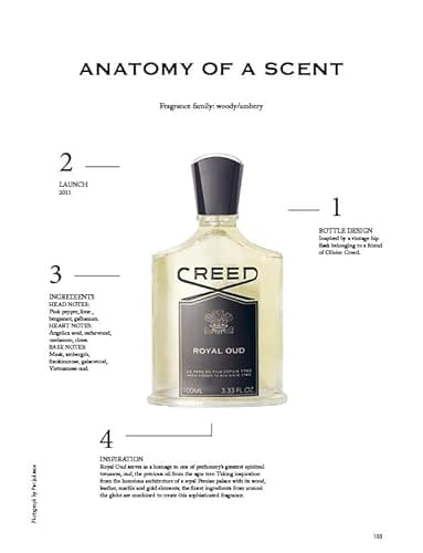 - Notes of lemon, cedar, and oud extracted from the rare agarwood tree brings Creed Royal Oud's woody fragrance to life. Wood, leather, marble, and gold of a Persian palace are the inspiration behind the architecture of Royal Oud