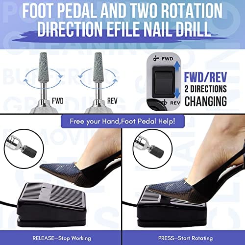 - Foot Pedal and Two Rotation Direction Efile Nail Drill: Two directions for left-hand and right-hand use. This nail files for acrylic nails is equipped with the F-Forward and R-Reverse buttons to change the direction of the rotating bit, which enables any right-handed or left-handed use. "Hand" mode and "Foot" mode for you to choose and better meet your requirement.