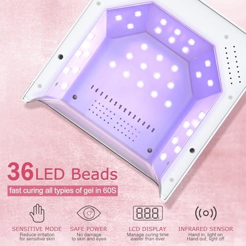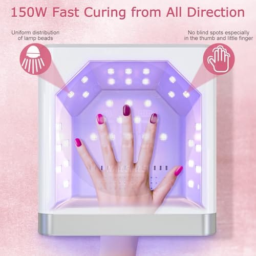 - Fast Curing for All Gels: Featuring 36 advanced UV/LED dual-light lamp beads, 150W nail lamp ensures quick and efficient curing for all types of gels, including base coats, top coats, color gels, builder gels, rhinestone glue, and more. The evenly distributed lamp beads provide consistent, thorough curing across the entire nail surface